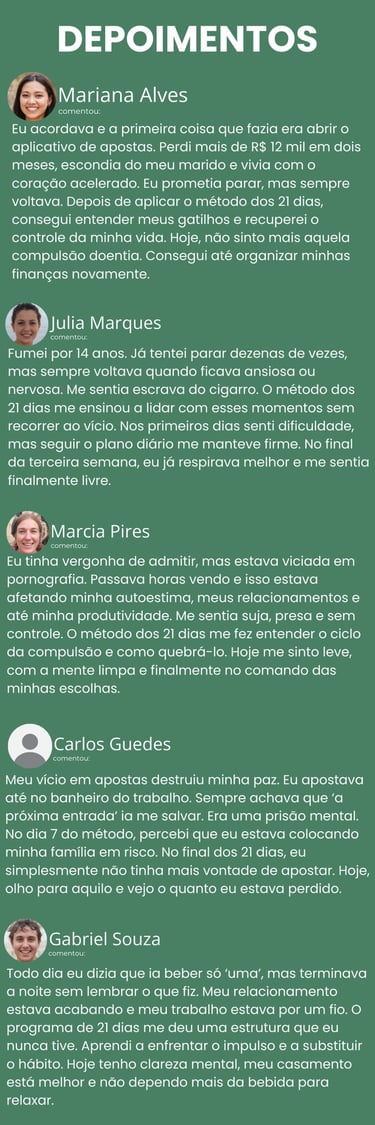 O método de 21 dias é simples, eficiente e pode ser aplicado por qualquer pessoa, independentemente do tipo de vício, celular, comida, álcool, pornografia, procrastinação, jogos, compras e muitos outros.